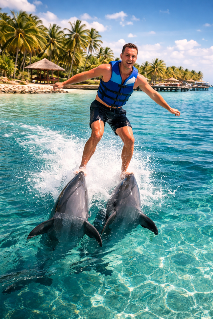 - Dolphin Excellence (Aprox $200 USD): La experiencia de lujo total. Nadarás con dos delfines al mismo tiempo y vivirás el emocionante «Foot Push», donde los delfines te empujan por los pies para elevarte sobre el agua como un superhéroe.